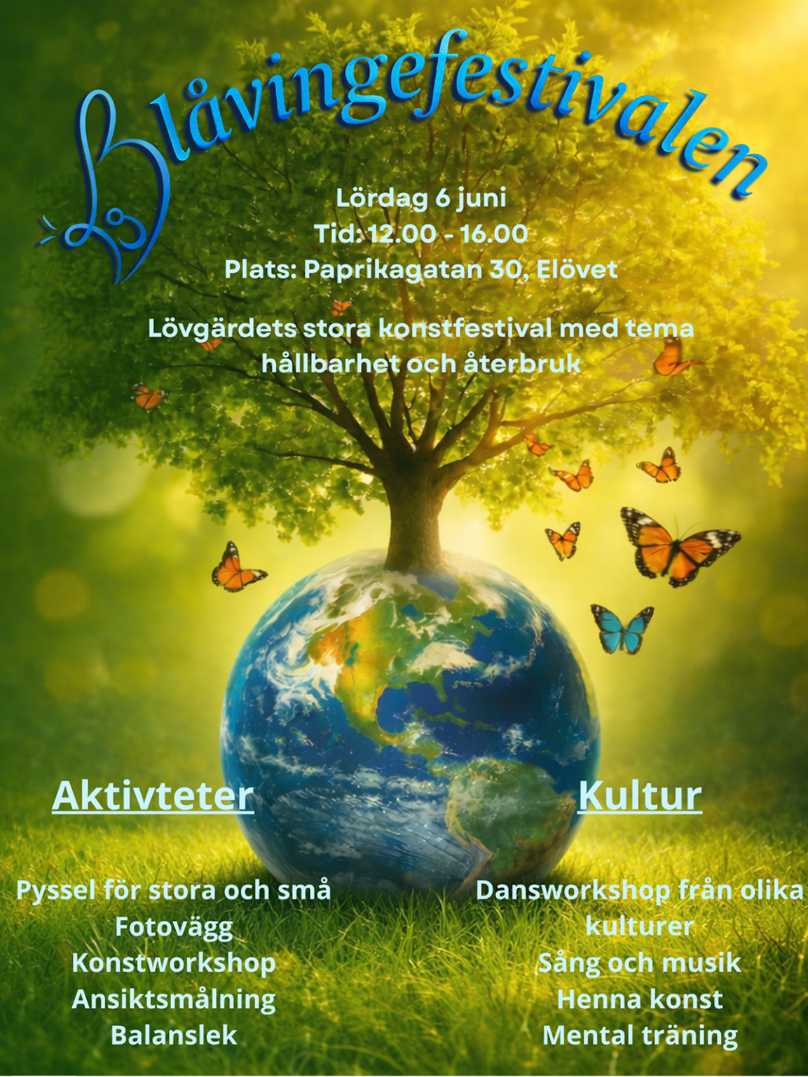 – Festivalen har fått sitt namn efter blåvingefjärilen, en vacker men delvis hotad art eftersom dess naturliga miljöer minskat i Sverige, berättar Sawsan. Den påminner oss om att hotade arter inte bara finns långt bort – utan även i vår egen närmiljö. Namnet knyter ihop konst, natur och ansvar för framtiden.